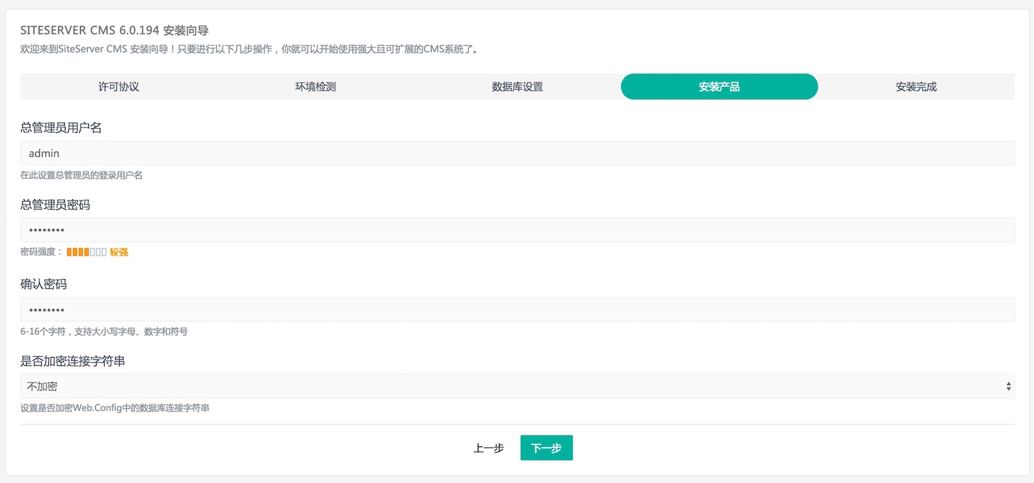 此帐号属于SiteServer CMS系统最高级别权限,所以帐号密码尽可能设置复杂一些,同时数据库连接字符串建议选择加密方式更安全。点击下一步,如果见到如下图所示界面表示SiteServer CMS安装成功。