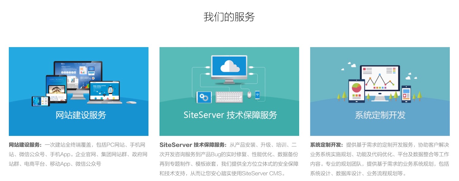 - SiteServer 技术保障服务:从产品安装、升级、培训、二次开发咨询服务到产品Bug的实时修复、性能优化、数据备份再到专题制作、模板嵌套,我们提供全方位立体式的安全保障和技术支持,从而让您安心踏实使用SiteServer CMS。